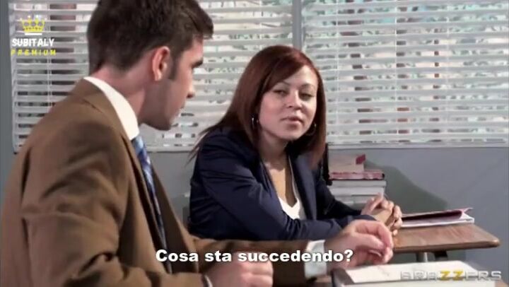 Audrey Bitoni, la professoressa troia, vede che lo studente Logan ha voti di merda per colpa della ragazza. Lo blocca in aula dopo la lezione, lo seduce e gli offre una scopata in cambio di voti alti. Gli fa leccare la figa, lo cavalca sulla cattedra e gli fa sborrare forte. Lezione hardcore di sesso con la professoressa porca!